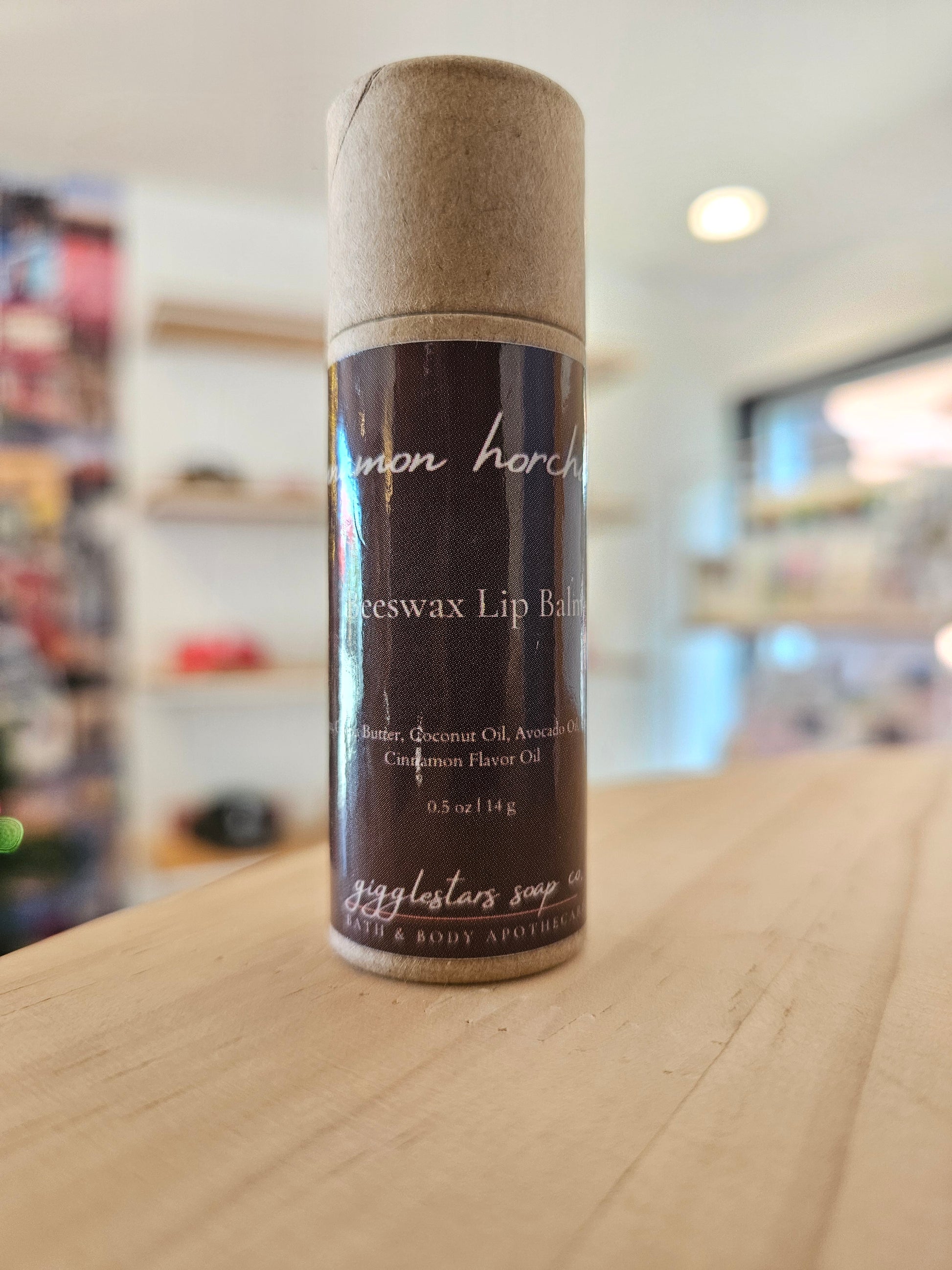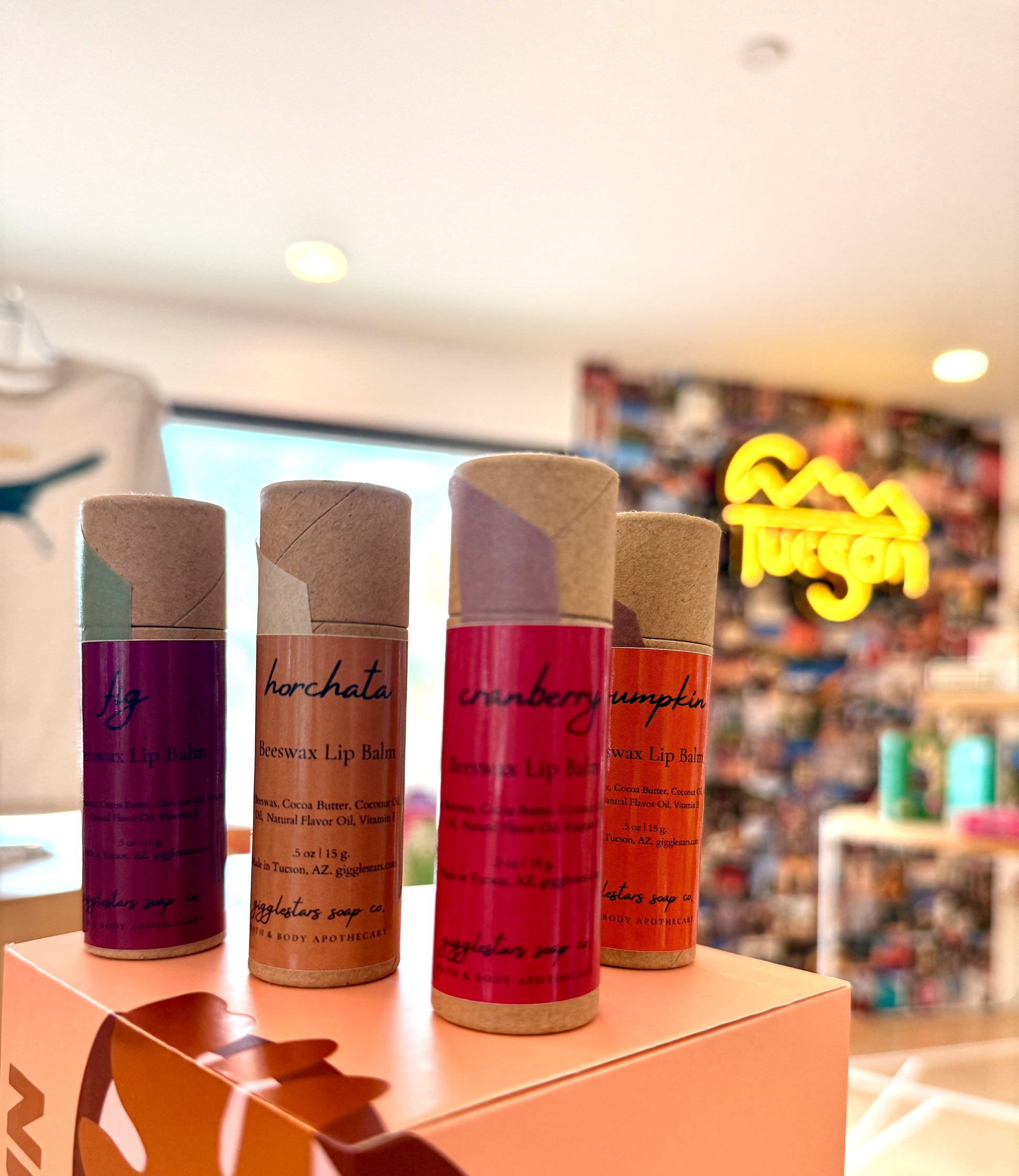 There lip balms are a dreamy blend of Beeswax, oils like Avocado Oil, Coconut Oil or Prickly Pear Seed Oil, Vitamin E, Cocoa Butter and Essential Oils.