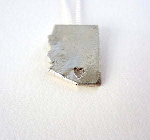 Arizona state shape necklace with a heart cutout over Tucson or Phoenix.