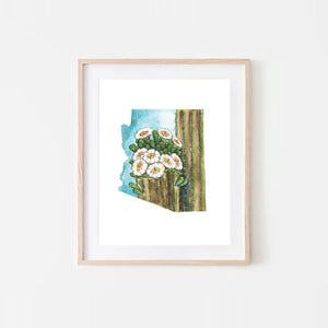 This colorful watercolor art print features an Arizona-shaped detail of a saguaro in bloom. This print was created from an original watercolor painting by Melissa Balkon.