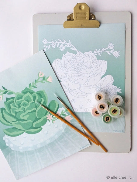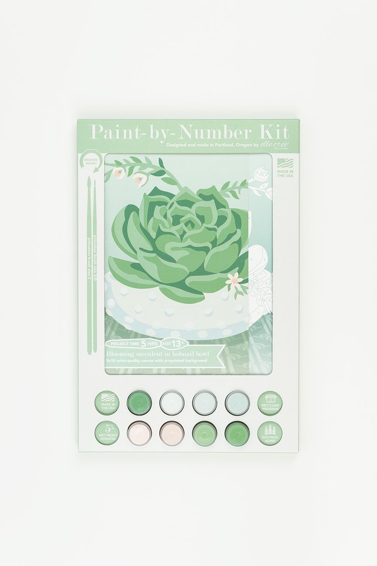 This paint-by-number kit depicts a rich green succulent plant with pink flower blooms in a pale blue hobnail bowl. The pre-printed background features an art nouveau style fabric tablecloth. Completing the painting can take between 3-5 hours. Recommended for ages 13 and up.
