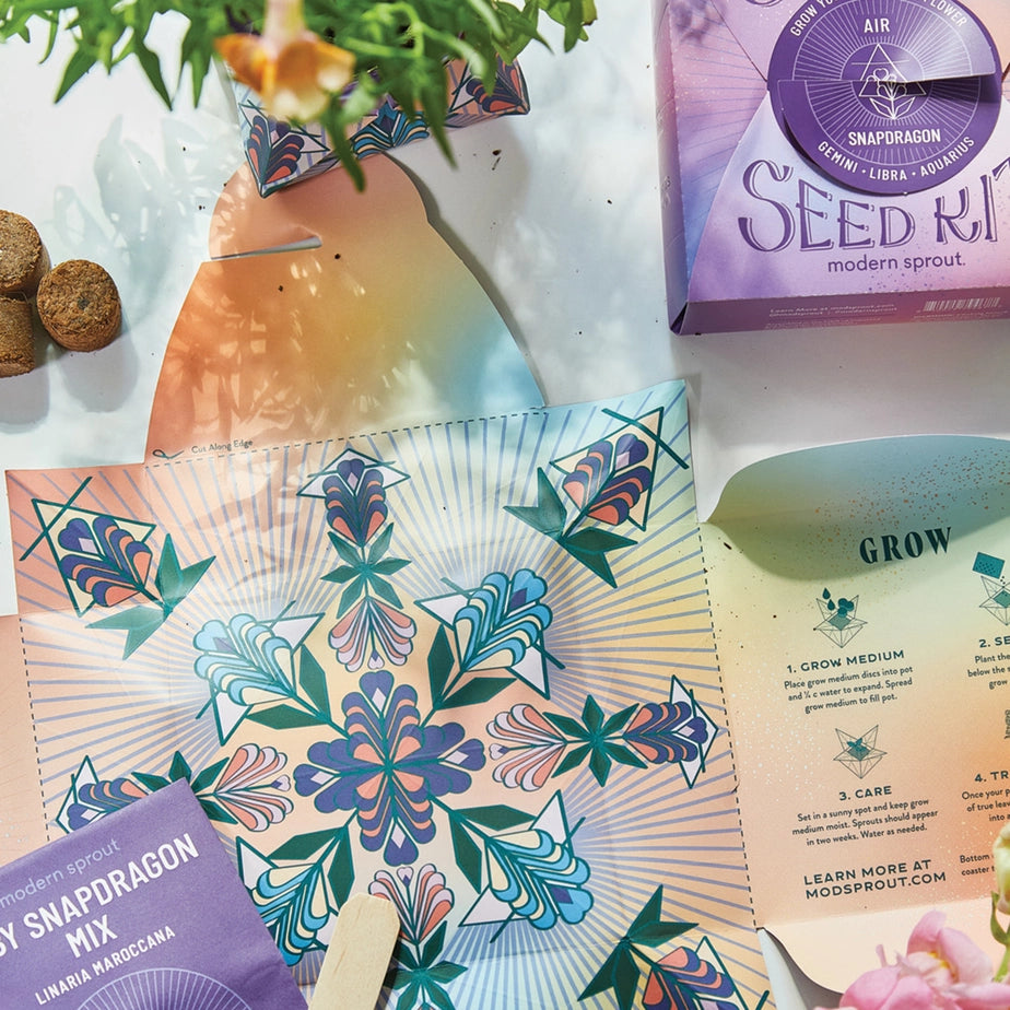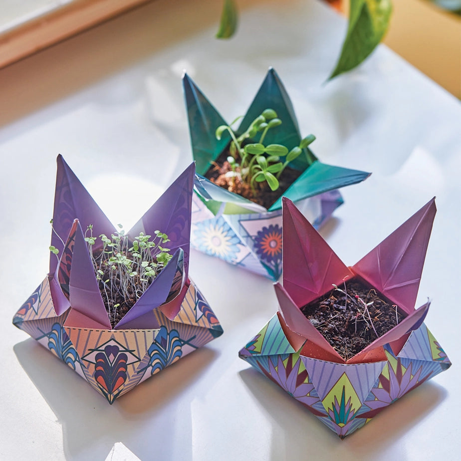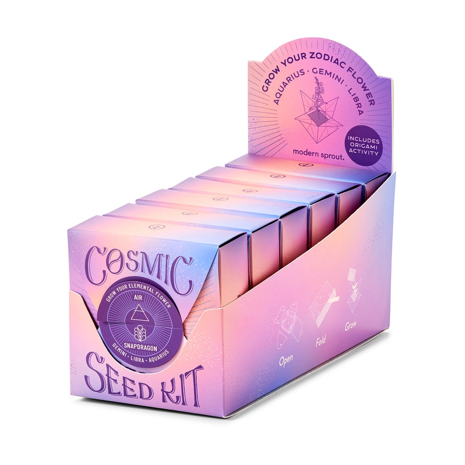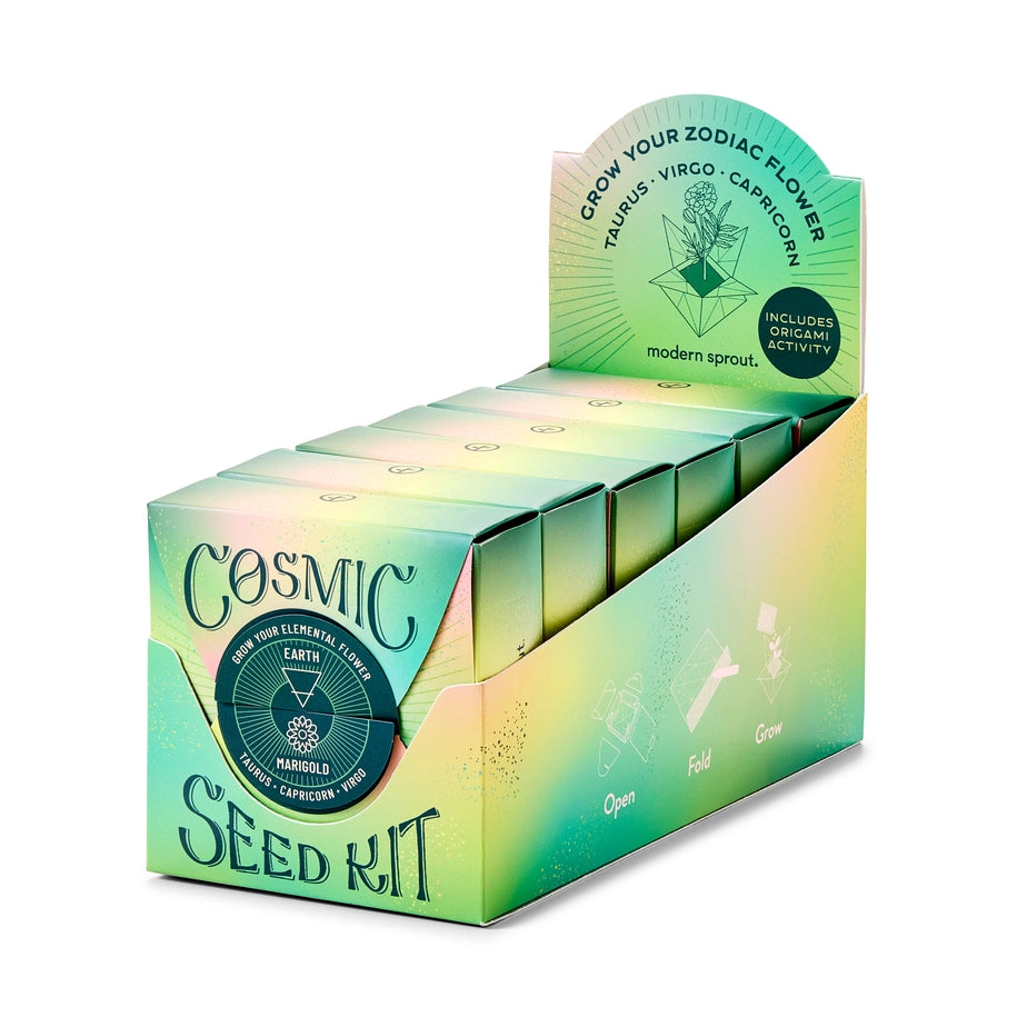 Connect to the cosmos by growing a flower inspired by your zodiac sign. As you unfold the box, you’ll discover the meaning behind your elemental garden. The box packaging can be refolded into an origami star pot for planting. Includes seeds, origami star pot activity with how-to video, grow medium and garden marker (use this to score your paper folds as well!).