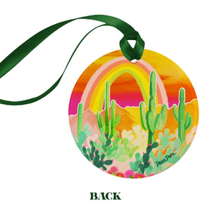 Trim your tree or walls with a work of art! My "Desert Rainbow" Porcelain Ornament illuminates your home with desert magic. Handpainted in watercolor by Artist, Paige Poppe this vibrant scene of glowing desert saguaros, blooming barrel cacti, and sun-soaked rainbows is captured on this Ornament. Packaged beautifully in an elegant box adorned with coordinating art labels, the "Desert Rainbow" Ornament is not just a stunning addition to your holiday collection but also the perfect gift for loved ones who appreciate the beauty of handcrafted art.