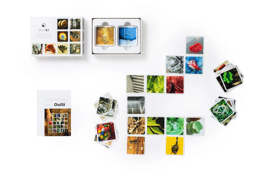 I see. You see. OuiSi! OuiSi Original is a set of 210 Visually Connecting Photo Cards that celebrate the beauty of everyday life. Each box includes a guide full of creative games and activities that ignite creativity and curiosity, regardless of age. Each Photo Card matches with many others in the set based on similar patterns, shapes and colors.