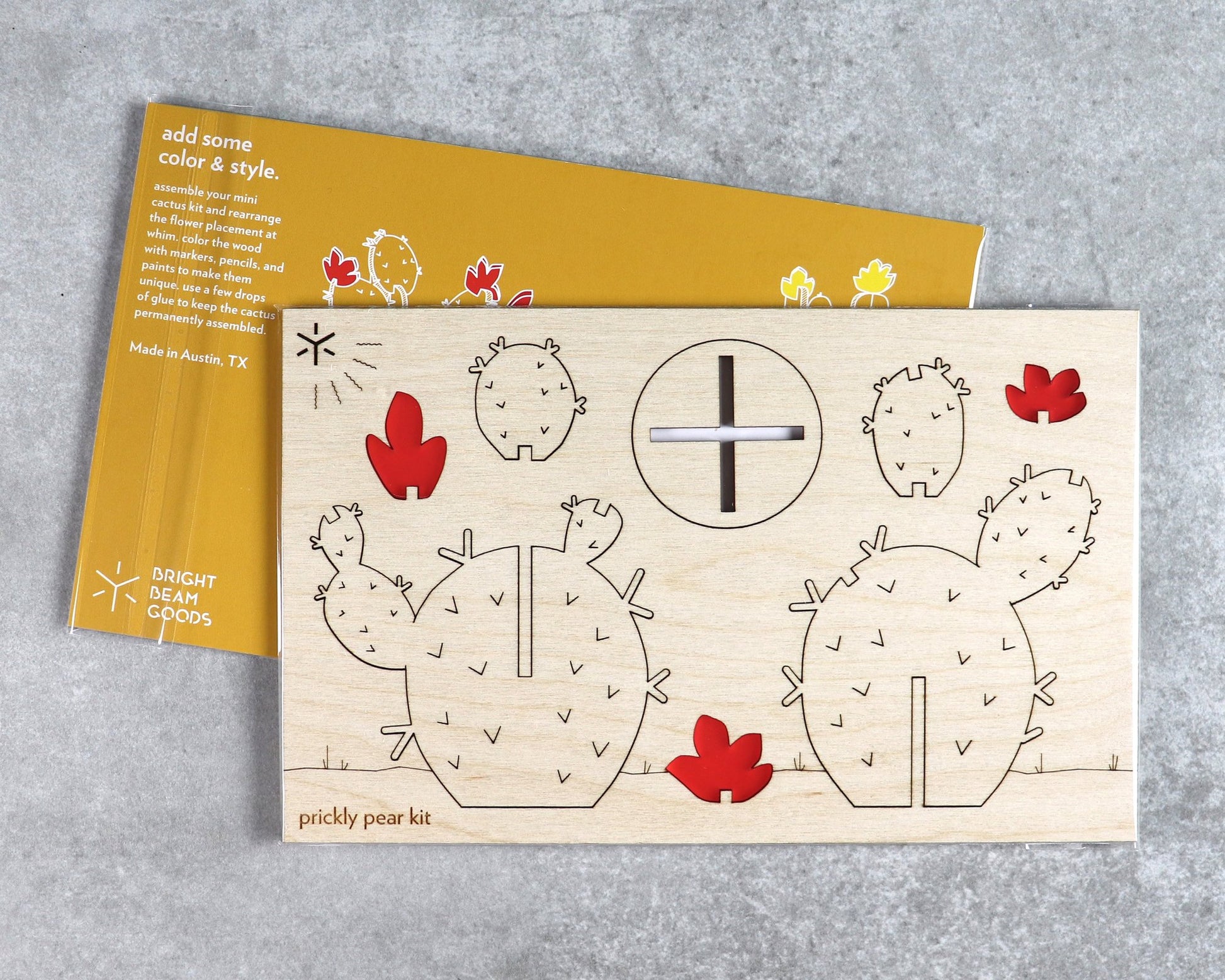 Color the wood with marker, pencils or paints, if desired. Assemble the wooden pieces in to the base, add the flowers to suit you personal style. Use a few drops of white glue to keep the saguaro permanently assembled. Unassembled, the kit measures 5" x 8", and arrives in a clear plastic sleeve with an instruction sheet.