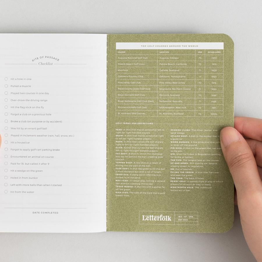 The Round of Golf Passport contains 20 entry logs to record meaningful details of each golf round played. Each entry page is accompanied by a blank page for memories, course notes, or shot selections. The back pages of the Round of Golf Passport include bucket lists, longest drive/putt logs, and checklists.