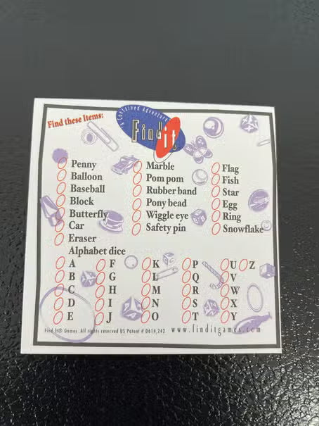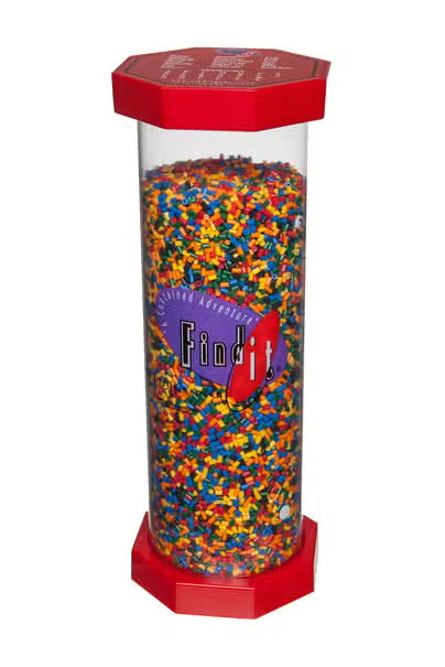 The Find It® KIDS version contains primary-colored pellets with 40+ hidden items. The end caps are a cheerful bright red. This version is perfect for the classroom, in the car, and easily transportable; no batteries or clean up required. The hidden objects are KID friendly and include each letter of the alphabet, a car, balloon, star, baseball, and the elusive hidden penny. The hidden objects are itemized on the top cap with a check off pad included with the game. All Find It® games are assembled in the USA.
