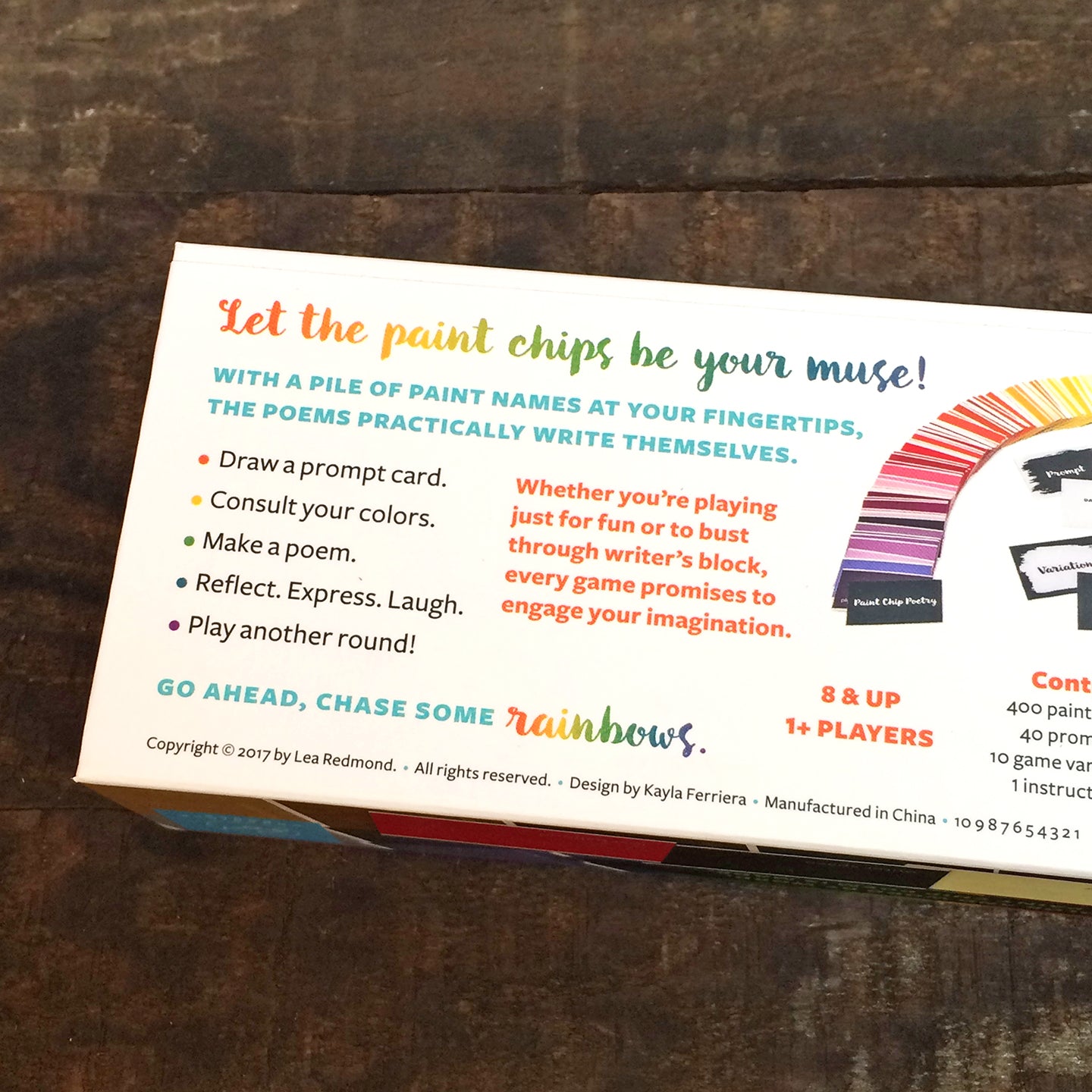 - UNIQUE CREATIVE GAME: Players draw handfuls of paint chips and a prompt card, then rearrange the chips to create spontaneous poems out of the color names.